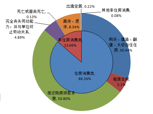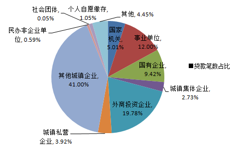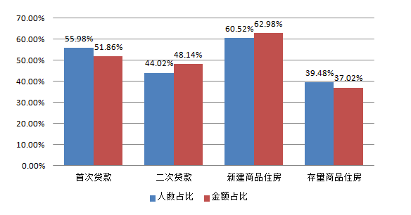 从贷款群体来看,刚需与改善型住房需求职工分别占贷款总人数的27.41%和63.69%。从单位性质来看,以其他城镇企业职工为主,贷款笔数和贷款金额占比分别为41%、39.98%。从购房面积来看,职工贷款购买小于90㎡、90-120㎡房屋居多,分别占贷款总人数的27.41%、37.18%。从主借人缴存基数来看,贷款主要以中、低收入职工为主,分别占贷款总人数的41.56%、55.41%。从贷款类型来看,纯公积金贷款和组合贷款占比分别为53.19%、46.81%。从贷款结构来看,首次公积金贷款职工占贷款总人数的55.98%,第二次住房公积金贷款人数占44.02%,说明我市住房公积金贷款政策在保障刚需职工需求,体现住房公积金互助性方面发挥了较大的作用,住房公积金制度的初衷未改变。具体放贷结构如下: