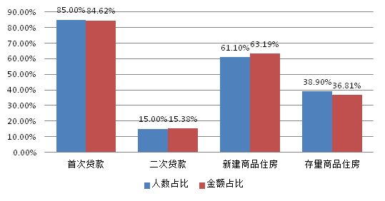 从贷款群体来看,刚需与改善型住房需求职工分别占贷款总人数的31.76%和61.36%。从单位性质来看,以城镇私营企业及其他城镇企业职工为主,贷款笔数和贷款金额占比分别为48.12%、46.05%。从购房面积来看,职工贷款购买小于90㎡、90-120㎡房屋居多,分别占贷款总人数的31.76%、37.24%。从主借人缴存基数来看,贷款主要以中、低收入职工为主,分别占贷款总人数的30.78%、67.04%。从贷款类型来看,纯公积金贷款和组合贷款占比分别为51.07%、48.93%。从贷款结构来看,首次公积金贷款职工占贷款总人数的85%,第二次住房公积金贷款人数占15%,说明我市住房公积金贷款政策在保障刚需职工需求,体现住房公积金互助性方面发挥了较大的作用,住房公积金制度的初衷未改变。具体放贷结构如下: