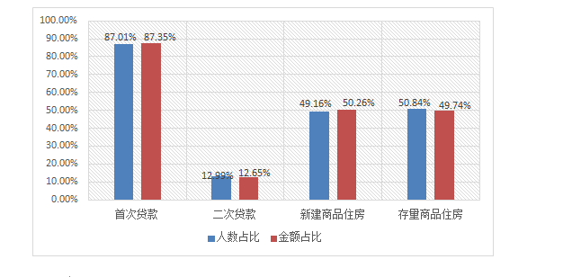 从贷款群体来看,刚需与改善型住房需求职工分别占贷款总人数的36.36%和57.02%。从单位性质来看,以城镇私营企业及其他城镇企业职工为主,贷款笔数和贷款金额占比分别为54.32%、54.23%。从购房面积来看,职工贷款购买小于90㎡、90-120㎡房屋居多,分别占贷款总人数的36.36%、33.9%。从主借人缴存基数来看,贷款主要以中、低收入职工为主,分别占贷款总人数的29.37%、69.23%。从贷款类型来看,纯公积金贷款和组合贷款占比分别为57.95%、42.05%。从贷款结构来看,首次公积金贷款职工占贷款总人数的87.01%,第二次住房公积金贷款人数占12.99%。具体放贷结构如下: