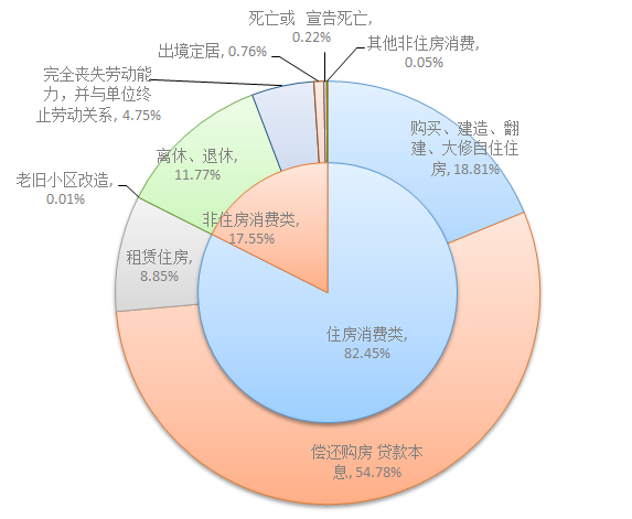 2023年二季度,住房消费类提取金额为50.67亿元,环比增长4.69%,占二季度提取额的82.45%。其中,购房购买、建造、翻建、大修自住住房和还贷提取占重要位置,提取金额分别11.56亿元、33.67亿元,占二季度提取额的18.81%、54.78%。具体提取结构如下: