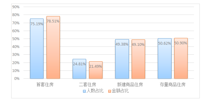 从贷款群体来看,刚需与改善型住房需求职工分别占贷款总人数的28.33%和64.49%。从单位性质来看,以城镇私营企业及其他城镇企业职工为主,贷款笔数和贷款金额占比分别为58.09%、56.88%。从购房面积来看,职工贷款购买小于90㎡、90-120㎡房屋居多,分别占贷款总人数的28.33%、39.39%。从主借人缴存基数来看,贷款主要以中、低收入职工为主,分别占贷款总人数的27.19%、71.41%。从贷款类型来看,纯公积金贷款和组合贷款占比分别为38.71%、61.29%。从贷款结构来看,首套住房公积金贷款职工占贷款总人数的75.19%,二套住房公积金贷款人数占24.81%。具体放贷结构如下:
