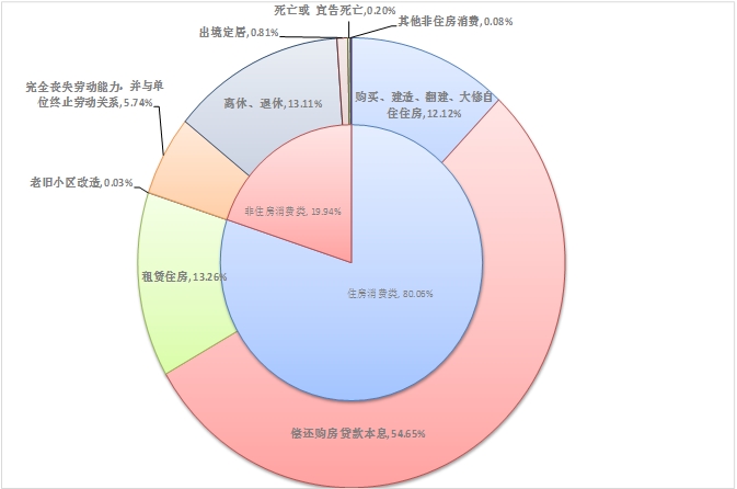 2024年一季度,住房消费类提取金额为52.31亿元,环比增长5.89%,占当季提取额的80.06%。其中还贷提取占比最高,提取金额35.71亿元,占当季提取额的54.65%。具体提取结构如下: