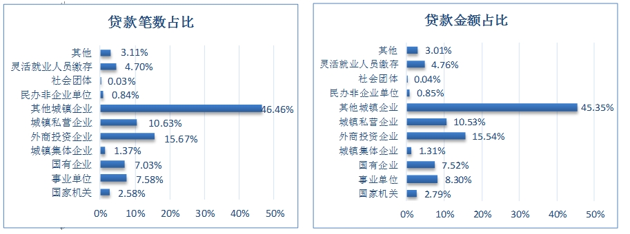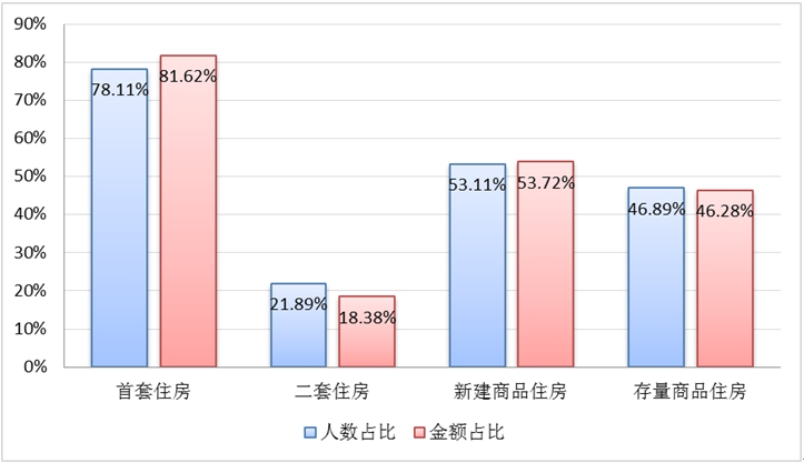 从贷款群体来看,刚需与改善型住房需求职工分别占贷款总人数的26.53%和67.73%。从单位性质来看,以城镇私营企业及其他城镇企业职工为主,贷款笔数和贷款金额占比分别为57.09%、55.88%。从购房面积来看,职工贷款购买90(不含)-120㎡房屋居多,占贷款总人数的43.06%。从主借人缴存基数来看,贷款主要以中、低收入职工为主,分别占贷款总人数的26.55%、72.25%。从贷款类型来看,纯公积金贷款和组合贷款占比分别为39.03%、60.97%。从贷款结构来看,首套住房公积金贷款职工占贷款总人数的78.11%,二套住房公积金贷款人数占21.89%。具体放贷结构如下: