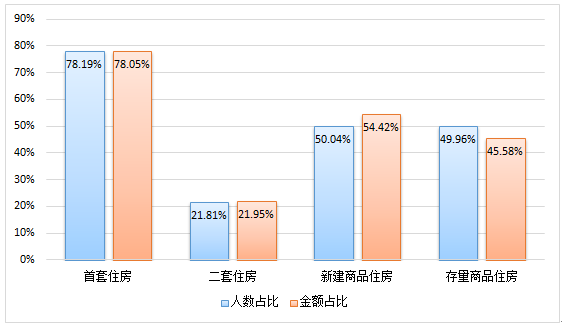 从贷款群体来看,刚需与改善型住房需求职工分别占贷款总人数的26.93%和65.56%。从单位性质来看,以城镇私营企业及其他城镇企业职工为主,贷款笔数和贷款金额占比分别为51.58%、49.23%。从购房面积来看,职工贷款购买90(不含)-120㎡房屋居多,占贷款总人数的40.28%。从主借人缴存基数来看,贷款主要以中、低收入职工为主,分别占贷款总人数的27.6%、71.39%。从贷款类型来看,纯公积金贷款和组合贷款占比分别为59.78%、40.22%。从贷款结构来看,首套住房公积金贷款职工占贷款总人数的78.19%,二套住房公积金贷款人数占21.81%。具体放贷结构如下:
