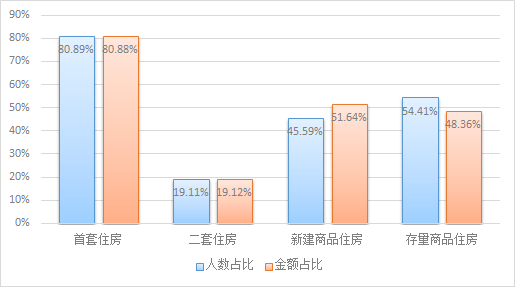 从贷款群体来看,刚需与改善型住房需求职工分别占贷款总人数的23.71%和59.91%。从单位性质来看,以城镇私营企业及其他城镇企业职工为主,贷款笔数和贷款金额占比分别为52.08%、52.9%。从购房面积来看,职工贷款购买90(不含)-120㎡房屋居多,占贷款总人数的43.3%。从主借人缴存基数来看,贷款主要以中、低收入职工为主,分别占贷款总人数的28.58%、70.69%。从贷款类型来看,纯公积金贷款和组合贷款占比分别为78.44%、21.56%。从贷款结构来看,首套住房公积金贷款职工占贷款总人数的80.89%,二套住房公积金贷款人数占19.11%。具体放贷结构如下: